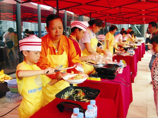 本報訊 昨日上午,南寧經(jīng)濟技術開發(fā)區(qū)在綠港·國際中心開展了以“關愛農(nóng)民工·綠港小廚神”親子活動,吸引了南寧經(jīng)開區(qū)園林綠化工人、水電維修物業(yè)工人、保潔人員等300多名進城務工人員及其子女參加。在活動現(xiàn)場,參賽小選手們在父母的指導下井井有條地備菜、炒菜、起鍋,忙得不亦樂乎。