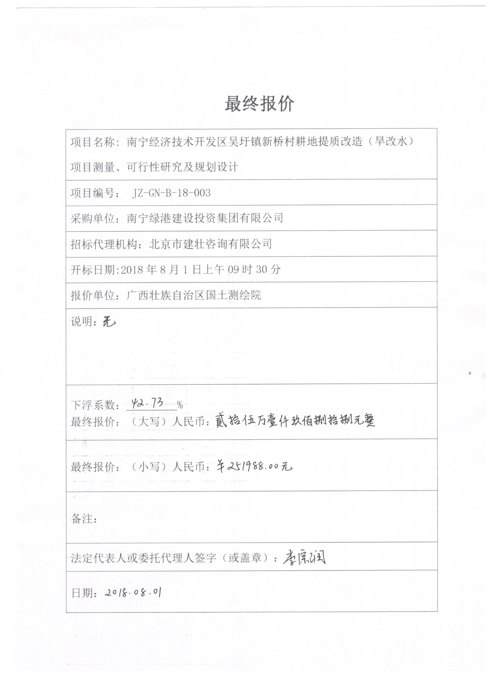 北京市建壯咨詢有限公司受南寧綠港建設投資集團有限公司委托,根據(jù)《中華人民共和國政府采購法》等有關規(guī)定,于2018年8月1日就南寧經(jīng)濟技術開發(fā)區(qū)吳圩鎮(zhèn)新橋村耕地提質(zhì)改造(旱改水)項目測量、可行性研究及規(guī)劃設計以競爭性磋商方式進行采購,現(xiàn)就本次采購的成交結果公告如下: