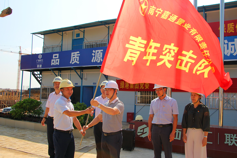 南寧空港科技產(chǎn)業(yè)園項(xiàng)目是南寧空港經(jīng)濟(jì)區(qū)的重點(diǎn)龍頭標(biāo)桿性產(chǎn)業(yè)項(xiàng)目,也是南寧市重點(diǎn)督辦的建設(shè)項(xiàng)目。為了更好地服務(wù)項(xiàng)目工程建設(shè),進(jìn)一步發(fā)揮黨員的先鋒帶頭作用和青年同志們的工作熱情,確保一期工程按時(shí)交付和整體項(xiàng)目早日竣工投產(chǎn),2018年9月29日上午,綠港集團(tuán)黨委在空港科技產(chǎn)業(yè)園項(xiàng)目施工現(xiàn)場隆重舉行“黨員先鋒隊(duì)”、“青年突擊隊(duì)”、“工人先鋒號”授旗儀式暨“一線送清涼”活動(dòng),綠港集團(tuán)黨委書記、董事長、總經(jīng)理龔國強(qiáng),副總經(jīng)理鄧?yán)^慧,副總經(jīng)理黃克,副總經(jīng)理、工會主席黃麗琴,項(xiàng)目“黨員先鋒隊(duì)”隊(duì)員、“青年突擊隊(duì)”隊(duì)員、項(xiàng)目一線建筑工人代表等共約80人參加了活動(dòng)。