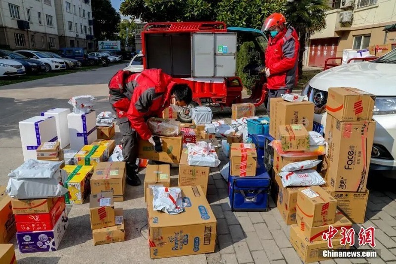武漢漢口常青花園社區(qū),快遞員卸下快件等待客戶前來取件。中新社記者 張暢 攝